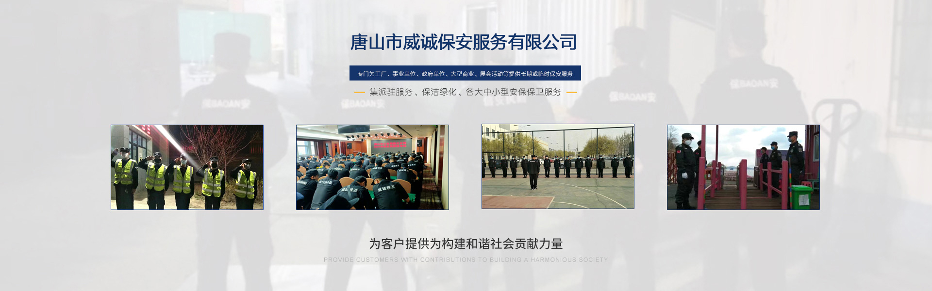 唐山市威誠保安服務有限公司自成立以來以“嚴防死守、忠于業(yè)主”為服務原則,以“客戶滿意、 合作共贏”為根本目標。以科學的管理、多方位多層次的服務,建立了首問責任制,完善了走訪、回訪 、滿意度調查、末位淘汰的預警管理,不斷提高服務質量,提高業(yè)主滿意度,提高企業(yè)形象。秉承“誠 實守信,紀律嚴明,團結協作,致精致誠”的服務理念,為客戶提供高品質、多方位、專業(yè)化的保安服務。 本公司制定了嚴謹的定向招生、崗前培訓、考核錄用、崗中培訓、持續(xù)培訓、末位淘汰制等一整套完善的管理體系。可以根據客戶的要求實地勘察評估,以量身定做的方式提供安保防范服務。